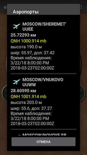 Устройства, оснащенные датчиком барометра, также могут получать высоту давления, которая преобразуется в высоту над уровнем моря. Для наиболее точных показаний, калибровки высоты давления путем ввода эталонного значения или выбрав одну из динамического списка приложения ближайших аэродромов. Данные аэродрома обычно обновляются каждые 20-30 минут.
