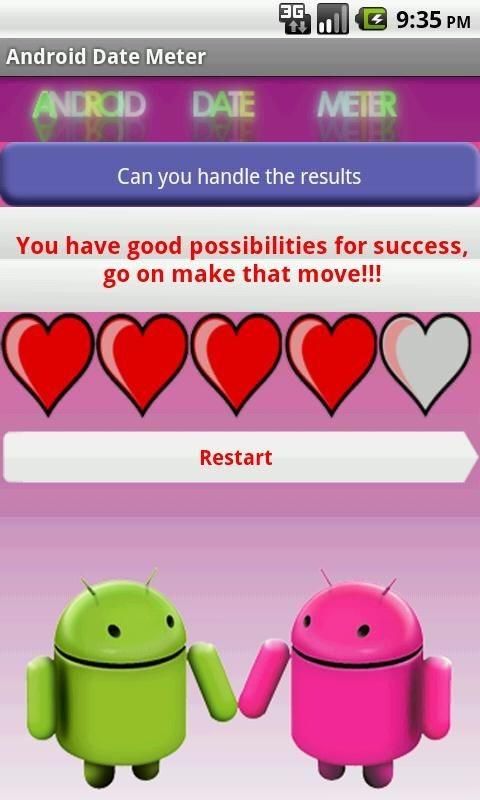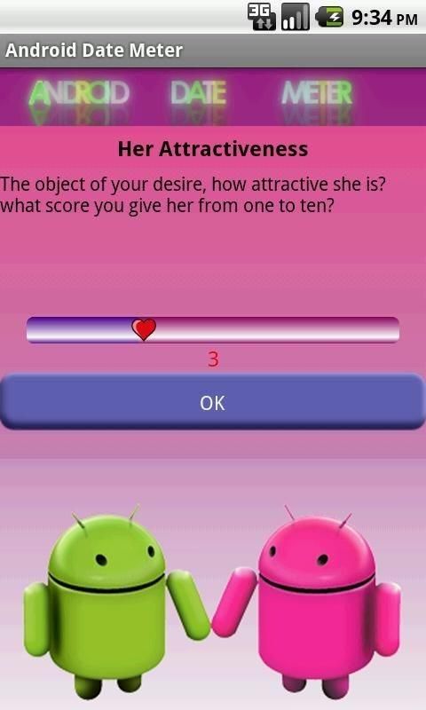 Android Date Meter v1.0 This "ANDROID DATE METER" application can assist you, to take the decision asking for a date a girl that you like. By inputting certain variables the "Date meter" will calculate for you the odds, of your success in asking. By using mathematics to represent the different variables that are affecting your chances of success when asking someone for a date, this android application on your android phones calculating for you your success chances. You will be prompted to insert in the application staff like: score of your attractiveness, of her attractiveness, your ability for whitty conversation, your willingness to persevere in pursuing her and finally whether the girl is single or not. Enjoy this application.