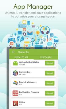 Android System Cleaner (Cleaner Box) is the best android cleaner app lightweight and totally free, to clean android phone: manage your applications, boost memory, eliminate junk files, stop stealthy running apps, optimize your Android system, and extend battery's life.