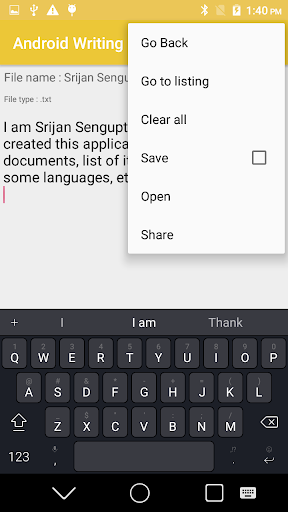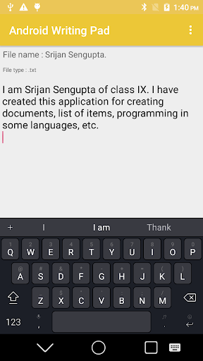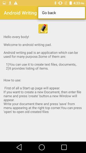 Android Point Pad Pad - это небольшое и быстрое приложение для создания и редактирования текстовых нот.Просто поместите свои заметки и отрегулируйте его вам.Просто запустите приложение и начните печатать.Это может быть легко сохранено на вашем устройстве.Это позволяет пользователям создавать редактируемые списки.
