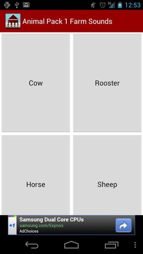 Animal Sounds 1 - Farm Sounds 4 buttons, 4 different real farm animal sounds. Animals included are Cow, Rooster, Horse and Sheep. Keep an eye out for more animals in future apps!