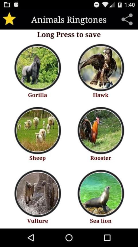 Звуки животных приложение имеет различные звуки, которые могут быть установлены в качестве сигнала вызова аварийных сигналов и уведомлений.