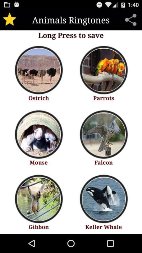 ☆ Установить животное или птица песни в качестве мелодии звонка, будильника или уведомления длительным нажатием на изображениях птиц.