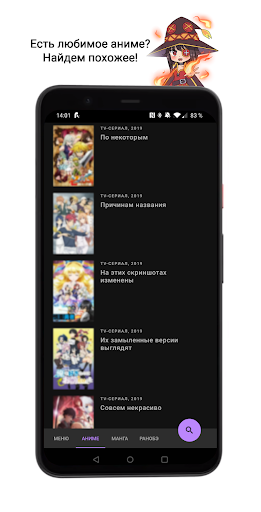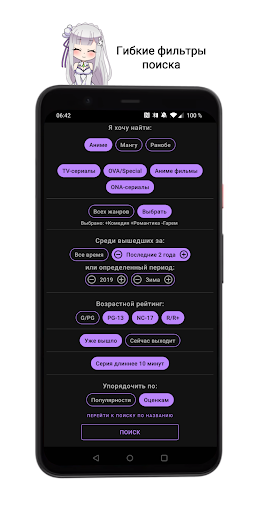 - Гибкие настройки поиска - год выхода, сезон, возрастной рейтинг, (не)онгоинг, длительность серий, популярное или с наивысшими оценками, поиск по названию