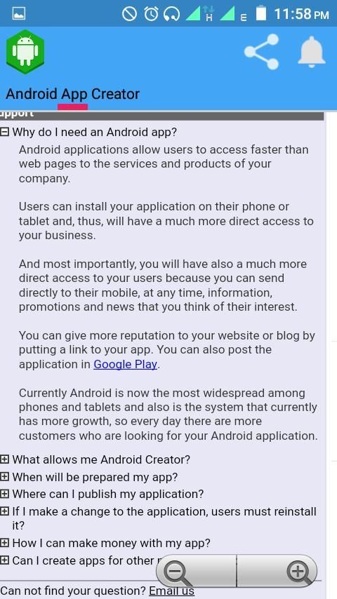 Приложение, которое вы будете создавать с Android Creator покажет свою контактную информацию (также в Google Maps), ваш сайт, ваши продукты и т.д. Кроме того, вы можете создавать свои собственные разделы, как вы хотите.