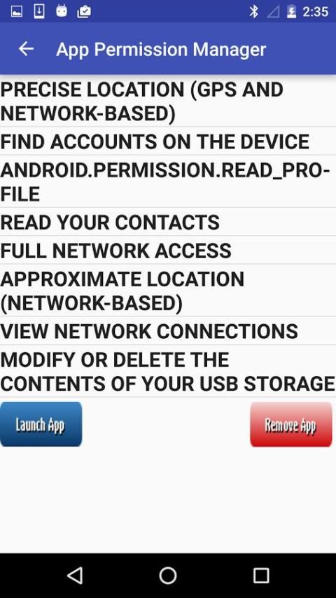 Это простое приложение, которое поможет вам просмотреть список разрешений других приложений, установленных в вашем использовании устройства. В нем перечислены все приложения, установленного на устройстве при открытии и при щелчке приложение будет список всех разрешений приложение использует. Пользователь может просмотреть список разрешений и запустить его оттуда или деинсталлировать приложение, если приложение использует ненужные разрешения.