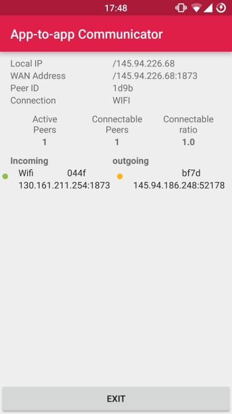 Приложение будет подключаться к другим, которые установлены это приложение и попытаться установить связь с ними. Это единственная функциональность этого приложения: получение прокол UDP NAT другим. Часть этой функциональности является обнаружение других и координирует попытку проколу. На этом первом экране приложения обнаруженные в настоящее время другие приложения Установок показаны. Для каждого пользователя другому статус пункции шоу в режиме реального времени.