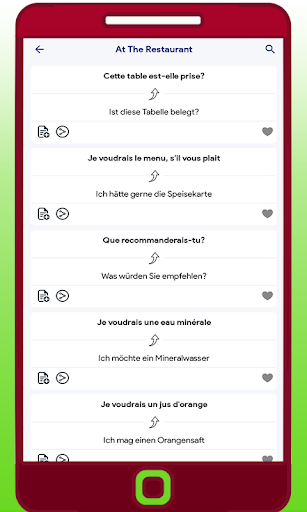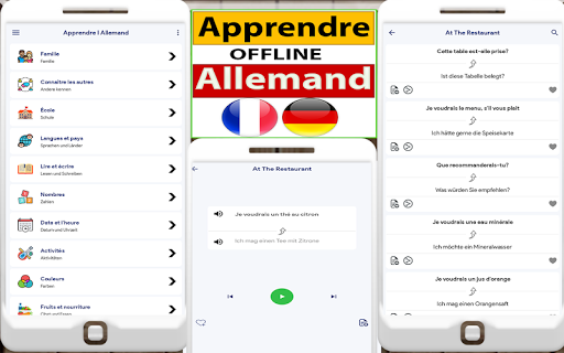 Vocabulaire Allemand Français est Gratuit pour tous les utilisateurs. Vous pouvez apprendre des phrases et des phrases complexes en un rien de temps. Parler Allemand l'application est utile pour les hommes d'affaires et les voyageurs d'apprendre les rudiments de la langue étrangère. Les utilisateurs peuvent apprendre la langue allemande et sa meilleure façon d'apprendre les alphabets allemands et la grammaire pour les débutants. Numero Allemand est également utile pour apprendre les verbes et le vocabulaire. Il fonctionne efficacement en ligne ainsi que hors ligne.