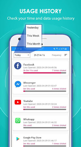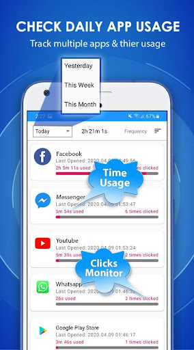 Использование времени мониторинга:- Иногда пользователь зависим от приложений в социальных сетях, что влияет на их стиль жизни, поэтому ему/ей может потребоваться ограничить его использование такими приложениями, которые, вероятно, помогут им избавиться от такого родаиз зависимостей, чтобы вы могли достичь такой цели, используя монитор приложений для использования времени, который покажет вам общее использование времени, количество кликов и в последний раз открытый тег для каждого приложения, через которые вы можете прекрасно измерить свое время для каждого приложения.