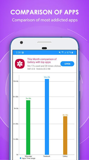 Сравнение с помощью барной диаграммы:- Вы можете сравнить свои данные и использование данных с большинством зависимых ведущих приложений, таких как приложения социальных сетей, с барной диаграммой, легко прочитать статистический анализ, с помощью которого пользователь может легко понять и отслеживать использование времени и использование данных, чтобы вылечитьApps Addiction.