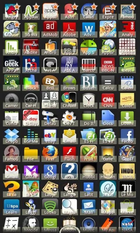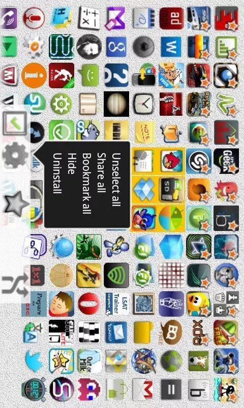 ↓ See instantly all your apps, at a glance and manage them directly and instantly (launch, random, share, bookmark, rate, uninstall), a nice time saving app ! This is a nice apps organizer to manage quickly all your apps. ♥ "love it!!! very simple and time saving!!" [muc♦♦] ♥ "Awesome - Really great for MIUI launcher. So fast to use!" [Yuv♦♦] ♥ "Nice app simply love it" [Amo♦♦] Main features: √ See all your apps, at a glance, all your apps in one screen √ Launch apps or selected apps at random √ batch hide/bookmark/share/uninstall apps √ shortcuts : launch random app from your homescreen √ random market search (shortcut) √ Choose custom background : textured backgrund available Just time saving !