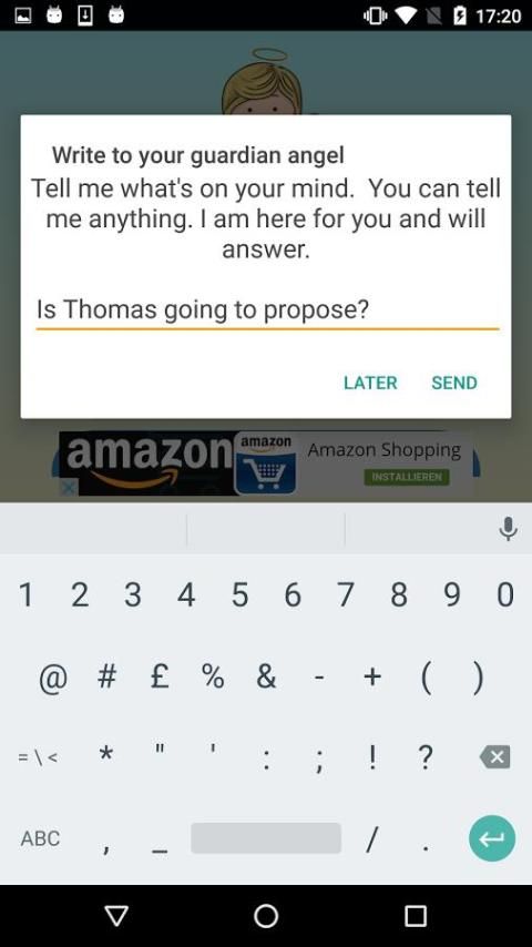 Это ваш личный ангел-хранитель и благословляет вас с цитатами мудрости. У вас есть проблемы, желание или просто вопрос, что вы хотите спросить? Просто введите ваш запрос напрямую в этом приложении. Мгновение спустя, ангел вышлем вам несколько советов. Независимо от того, что вас беспокоит, это приложение поможет и поддерживать вас. Это ангел-хранитель защищает вас и есть ответ на любой вопрос. Твой ангел будет вдохновлять вас, советую вам и защищать вас каждый день. Приложение ASK ангел развлекательные, умный и может быть обнадеживающим.