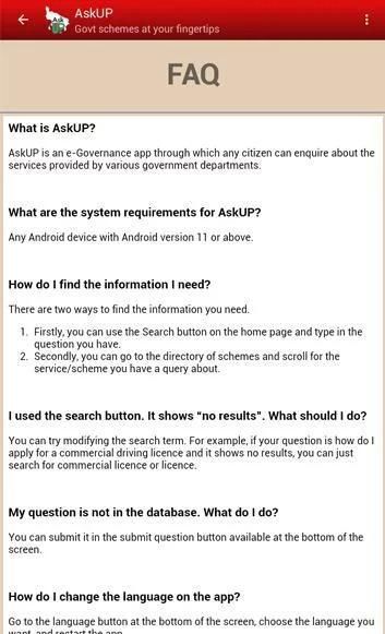 Информация, которая AskUP обеспечит включает G2c услуги со всех отделов, таких как развитие сельских районов, сельского хозяйства, социального обеспечения, дохода, электричества, здравоохранения, муниципальных, полиции, образования, промышленности, коммерческого налога и т.д. Это часто задаваемые вопросы, как это, право критерии, необходимые документы, процедуры, время обработки, адреса заинтересованных ведомств и официальные числа должностных лиц, ответственных.