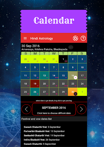 ⋆ Calendar shows the dates of current month and when you tap on the any date it will show current date information and when you long tap it will show the panchang of that day and at the bottom we will provide the festival list of that month user are able to change date and year with easy UI.