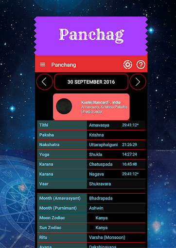 ⋆ Panchang show the information related to astrology एस्ट्रोलॉजी panchang it contains the info like tithi,paksha,nakshatra,yoga,zodiac etc. User can get the info relating to sun rise and sun set in the panchang. as per the our info punchang is depend on the location so user can change the location and date and get the accurate panchang information.