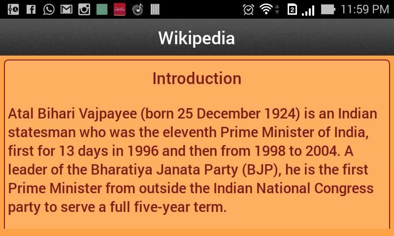 Атал Бихари Ваджпаи (родился 25 декабря 1924) является индийский государственный деятель, который был одиннадцатым Премьер-министр Индии, впервые за 13 дней в 1996 году, а затем с 1998 по 2004 год лидер Бхаратия Джаната Парти (БДП), он сначала Премьер-министр из-за пределов партии Индийский национальный конгресс на полный пятилетний срок.