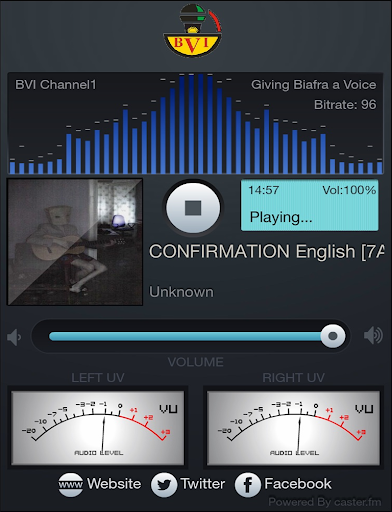 Голос BIAFRA, известный как Biafra Voice International (BVI Channel 1) - это наряд медиа-нарядов коренных народов Biafra, оседлал ответственность за адекватно информировать, воспитание, просветить и мобилизацию коренных народов BIAFRA во всем мире и, а также и информированию членовМеждународного сообщества о коренных народах BIAFRA право на самоопределение и необходимость неизбежного и безусловного освобождения Биафры из одной Нигерии.