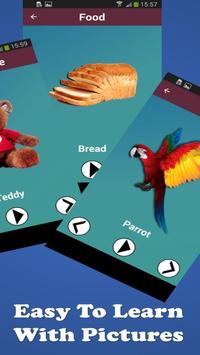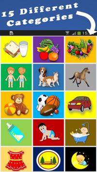 We have designed this app with 15 different categories and 150 items (Food, Fruits, Vegetables, Parts of Body, Pets, Farm Animals, Toys, Sports, Vehicles, Eating Time, What I Do, Bath Time, Cloth, At Park, and Sleeping Time.