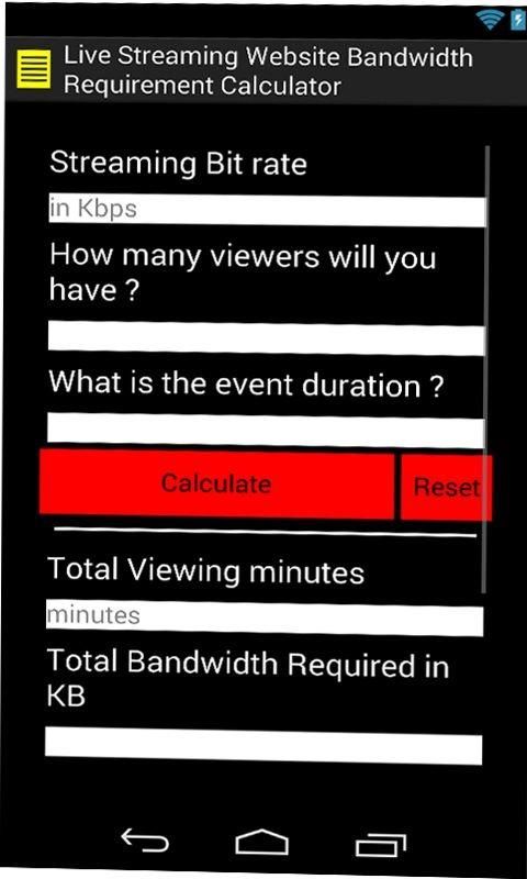 This bandwidth calculator app helps you to calculate the total requirement of bandwidth allowance and connection speed based on streaming bit rate, connection and time duration for live streaming websites.