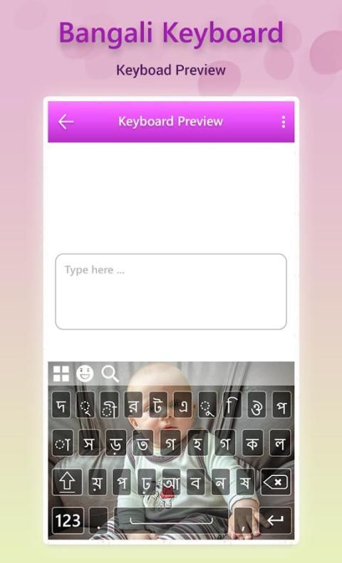 В опции изображения можно настроить изображение или фотографию клавиатура фона и увидеть превью клавиатуры, когда его открыта для типа в Bangla.