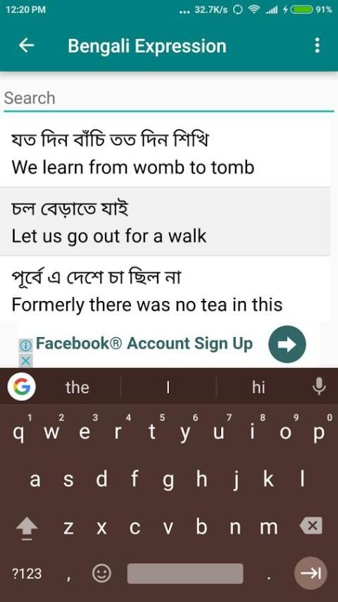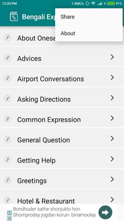 Бенгальский Выражение (Bangla Translation) представляет собой приложение для изучения языка, который обеспечивает обычно используемые выражения на различные темы, такие как торговый разговор, аэропорт разговора и т.д. Это приложение помогает говорить на английском и бенгальском языках.