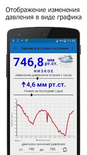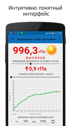 Главной особенностью приложения является отображение атмосферного давления в строке состояния устройства.