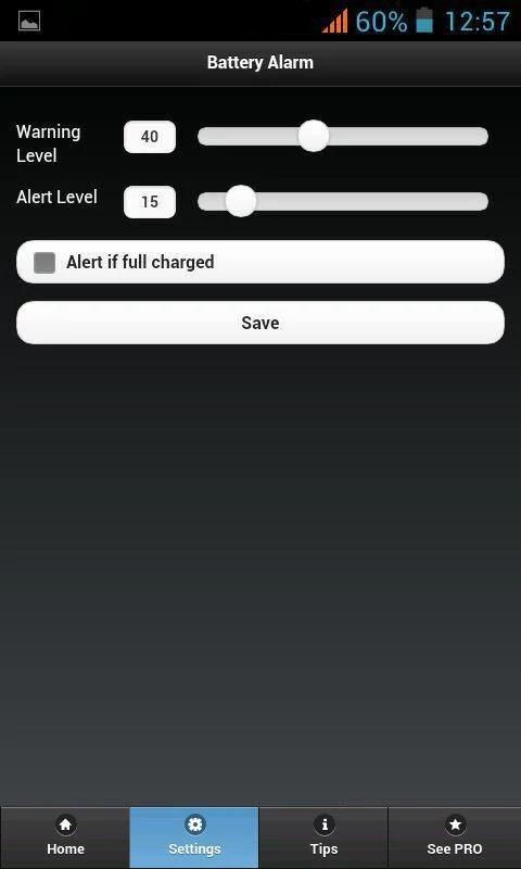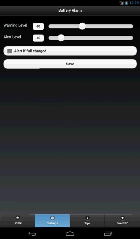 Несколько простых шагов, чтобы установить уровни платежей вы предпочитаете, и удобной звуковой сигнал уведомит вас о состоянии вашего аккумулятора. В PRO версии вы можете также выбрать звуковой сигнал, который вам нравится среди ваших плейлист!