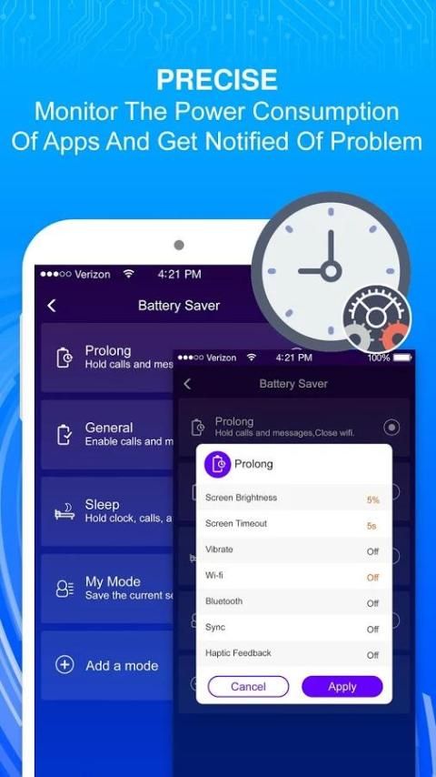 Контролировать все приложения, которые истощают энергию, а не в использовании и напомнить пользователю о высоких приложениях потребления. Показывает, сколько энергии батареи будет продлено, если вы используете сохранение 1-крана. Монитор потребления энергии всего запущенного-приложение и перечислить вам детали для менеджера приложений, Battery Monitor, ясно показывает состояние батареи и использование;