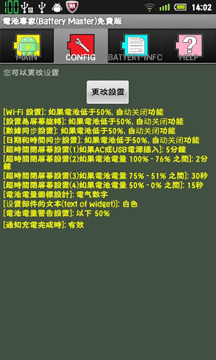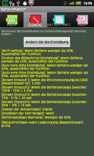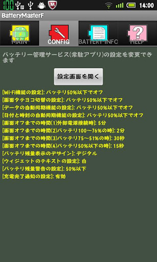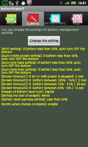 You want to save the battery of the device?This application is recommended.quot;Battery Masterquot; helps you to conserve the battery of the device.BatteryMaster will display the battery indicatordisplay at status bar andWidget. and this is aBattery management service applications help you to conserve battery.About ads:This free app is ad supported and contain ads in the notification tray.There is no icon ads on home screen.The difference between free version and paid version of this app is only the existence of ads. Who do not want to display ads, please use the paid version.Features:Charging time display:When charging the battery, Displays the estimated time until the battery is 100 on Notification screen.Battery available time display:When the device is using the battery,Displays the estimated time until the battery is 0 on Notification screen.The left side time is calculated from the average electricity consumption has been recorded from the power supply is disconnected.The right side time is calculated from the highest electricity consumption has been recorded.Battery indicator: Displays of battery indicator in the status bar. The status bar icon changes color depending on the battery.100 to 76 green, 75 to 26 yellow, 25 or less: red.The CONFIG screen can also change the design of the Battery iconBatteryStarHexagonCatDigital.Battery indicator Widget:Widget Displays of battery indicator on home screen. Color and design of the widget is synchronized to icon of status bar.Text is displayed in the available time or battery charge time.wifi AutoONOFF:Thefeature is automatically turned off when the battery is lower than the value set. If the battery is restored or connected to external power,feature is automatically turned on.bluetooth AutoONOFF:Thefeature is automatically turned off when the battery is lower than the value set. If the battery is restored or connected to external power,feature is automatically turned on.Screen rotation AutoONOFF:Thefeature is automatically turned off when the battery is lower than the value set. If the battery is restored or connected to external power,feature is automatically turned on.AutoSyncData feature ONOFF:Thefeature is automatically turned off when the battery is lower than the value set. If the battery is restored or connected to external power,feature is automatically turned on.ScreenTimeout AutoChange:Depending on the battery level and automatically change the time until the screen off.Battery level warning:If the battery level is less than the value of setting,the application notifyby sound and message.Notify when charge complete:Notify when charge complete by sound and message.How to use:First you start the application,Please push the quot;START SERVICEquot;button,battery level will be displayed in the status bar.information about ads and permissionThis free app is ad supported.There is no icon ads on home screen.Corporate information of deliver ads is following URL http:airpush.comaboutusThe following permissions are set for advertising process.quot;android.permission.INTERNETquot; Internet accessquot;android.permission.ACCESSNETWORKSTATEquot; Gets the state of the networkquot;android.permission.RECEIVEBOOTCOMPLETEDquot; Detection of the completion the boot of Androidquot;android.permission.READPHONESTATEquot; Read phone statequot;android.permission.ACCESSCOARSELOCATIONquot; Approximate location informationThese permissions are used from the library fileAirpushSDK.jar for the ad.These permissions are not used for purposes other than advertising.If you delete the app files ,advertising are also removed.If you dislike the Airpush Advertising, using this application is not recommended.