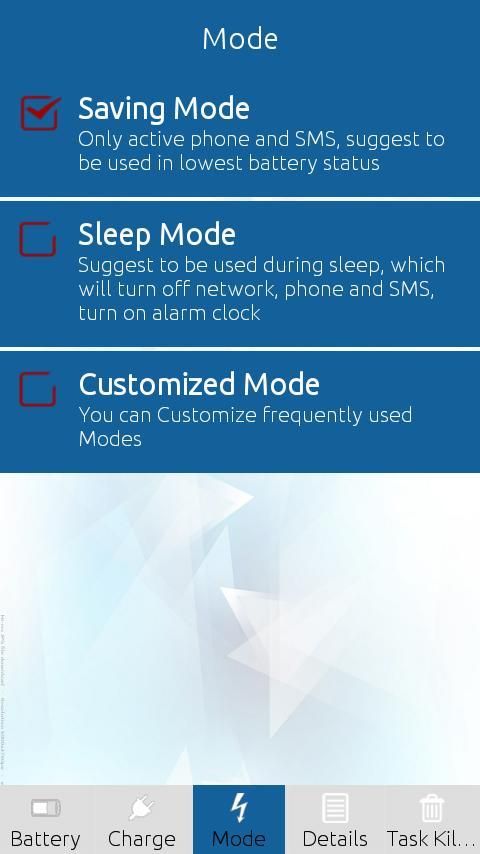Вы находитесь в полный контроль батареи вашего Android устройства при установке нашей экономии батареи приложение. Включить питание вкладку экономии, и оставить все до нашей батареи врачом или оптимизировать приложения и функции телефона вручную. Используйте опцию Task Killer и вручную выбрать задачи, чтобы убить. С помощью этого приложения монитора батареи, найти батареи оставшееся время, время зарядки, сохранение, сна или индивидуальные данные режима и т.д.