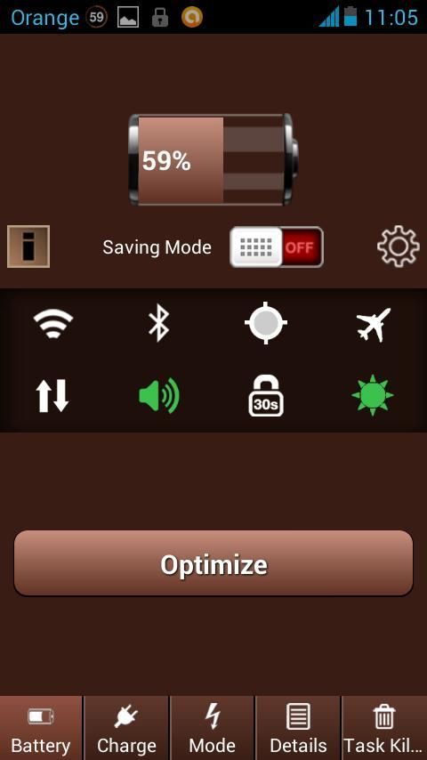 This application provides the best features to saves the battery time of your phone or your tablet and is capable of extending your battery life. Easy and Faster to use. Different styles of widgets. Languages supported: German, French, Italian, Portuguese, Japanese, Korean, Russian, Arabic, Spanish, Hebrew, Dutch, Chinese and Thai. Features: Turn On/Off the Wifi. Managing the brightness. Managing the screen timeout. Switch On/Off the bluetooth. Switching On/Off the Mobile Data. Turn On/Off the GPS. Switching On/Off the Airplane Mode. Specially provides notification when your device battery goes down. Battery Details: Current in mAH. Health Condition. Voltage in mV. Technology used. Plugged via USB or wall mount charger. Temperature in Celsius(ºC). Show Status if Charging or not charging. Charge Mode Details: Fast Charge. Full Charge. Trickle Charge. Task Killer Feature: Display all the running apps. Kill the running task for power optimisation and memory consumption. Working as Memory Booster. Three types of Mode: 1. Saving Mode: (Suggested to use in lowest Battery Status). Brightness set to 10% InActivate Wifi of the Device. Stand By time set to 15 seconds. 2. Sleep Mode: (Suggested to use when you sleep). Turn Off Call & SMS and turn ON the Flight Mode. Vibrations Off. Sound Off and mute the device. Brightness set to 10% 3. Customised Mode. Easily customise all the modes depend on your usage to save Battery as much as you need. Can adjust the battery saving setting freely depend on your need and usage. Can adjust sound, wifi, device brightness, bluetooth, vibration, synchronisation and stand by time.