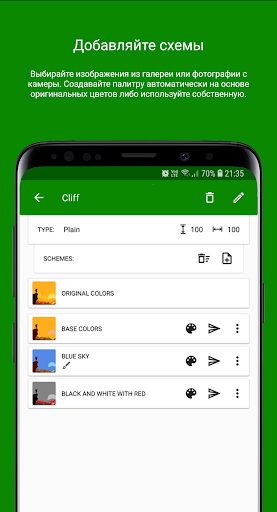 Добавляйте схемы: выбирайте изображения из галереи или фотографии с камеры. Создавайте палитру автоматически на основе оригинальных цветов либо используйте собственную.