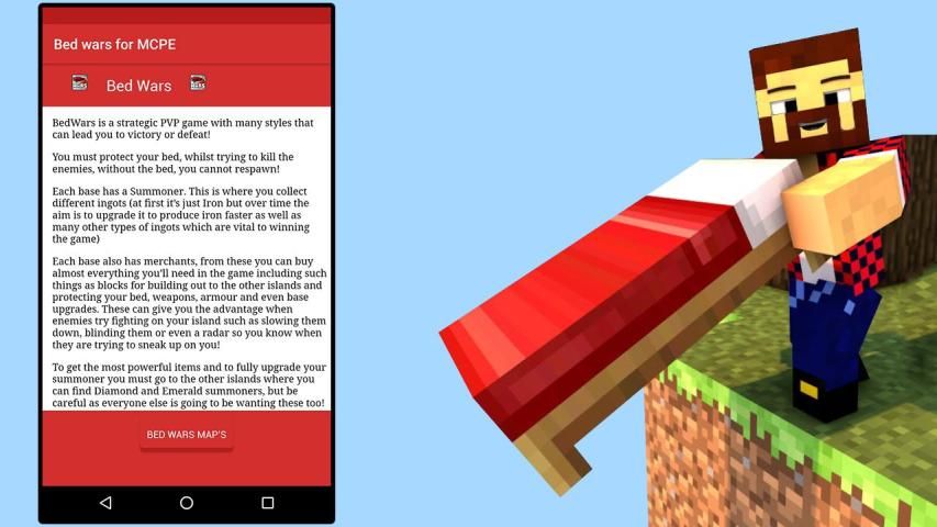 В постели войны в карманном издании вы должны уничтожить все вражеские кровати перед ними. Играть bedwars в Minecraft очень легко с этим приложением. Просто следуйте инструкциям, чтобы подключиться к официальному серверу постельных войны и игр.