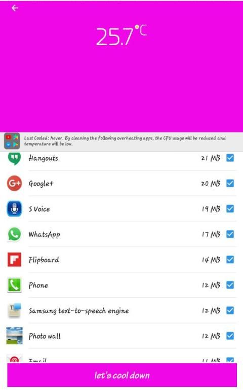 Мастер интерфейс смарт-Charge Cooler красиво оформленный с большим количеством полезных функций, которые помогут вам с приятным опытом при использовании охлаждения программного обеспечения телефона, чтобы снизить температуру, когда машина перегревается, процессорный кулер мастер телефона кулер. Вы можете играть в игры, смотреть фильмы или работать в Интернете больше не боится машины постоянно перегревается (Phone температура влияет на срок службы аккумулятора телефона. Необходимо охладить температуру телефонов, чтобы избежать повреждения оборудования). Cooler Master Альфа будет выдавать предупреждение, когда температура телефоны и телефон помогают более низкие температуры с режимом охлаждения Cooler Master остыть телефон.