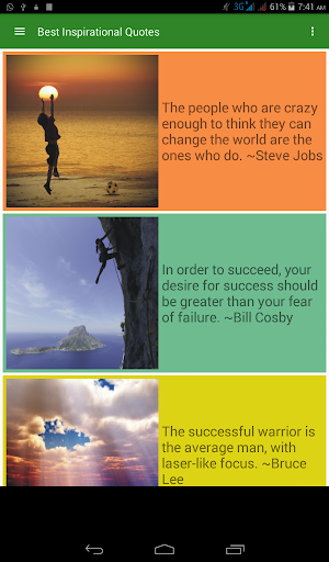 If you are looking forward for self motivation or getting inspired to achieve great things, you are at right place. Best Inspirational Quotes app developed by Vibhu Systems has an eclectic collection of Inspirational and motivational quotes from famous personalities around the world. This app has: