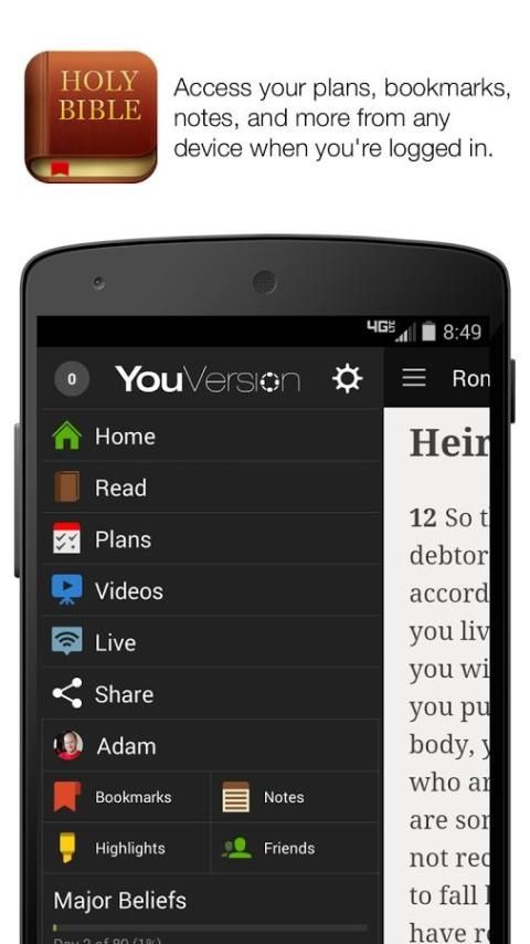 On more than 100 million devices all over the world, people are reading, listening to, and sharing the Bible using the Number 1 rated Bible App—completely free. Hundreds of Bible versions, hundreds of reading plans, dozens of languages. Add your own highlights, bookmarks, and public or private notes. Customize your reading experience. Access everything when you’re connected, or download specific versions for offline use. READ THE BIBLE * Set your Bible App’s interface for your choice of more than 30 languages. * Easily select from hundreds of Bible versions, in nearly 150 languages. * Choose from popular versions like the KJV, GNB, NIV and CEV * Offline Bibles: Read even without network access. * Listen to audio Bibles as you do other tasks. (Audio Bibles not downloadable.) STUDY THE BIBLE * Hundreds of reading plans: Devotionals, topical plans, portions of the Bible, or the whole thing. * Many reading plans are even available in multiple languages. * You’ll find devotionals, as well as plans that lead you through specific topics, portions of the Bible, or even the entire Bible. * Search the Bible using keywords. CUSTOMISE YOUR BIBLE * Highlight with custom colours—just like a paper Bible. * Share verses with friends using social networks, email, or text. * Bookmark passages: Share, memorise, or just keep track of your favourites. * Add notes to passages: Keep them private so only you can see them, or make them public to share with friends. * With a free YouVersion account, see all of your notes, highlights, bookmarks, and reading plans on any supported device. * Read easier with settings like fonts, text size, and contrast for bright or low-light conditions. YOUR PRIVACY ON ANDROID * The Bible App requests access to your phone calls in order to pause audio playback if you're listening to a Bible when a phone call comes in. * The Bible App requests read/write access to your SD card because that's where Bibles are downloaded and stored if you choose to do so. * The Bible App requests access to your account list to help the signup process go more smoothly. If you choose to sign up with an account connected to your device, you can skip the verify step. * We do not sell any personal information you provide us, nor will we share it without your consent. You can read our privacy policy at http://youversion.com/privacy. CONNECT WITH YOUVERSION * Contact support from directly inside the Bible App. * Like us on Facebook: http://facebook.com/youversion * Follow us on Twitter: http://twitter.com/youversion * Catch up on the latest on our blog: http://blog.youversion.com * Use YouVersion online: http://bible.com Download the world’s Number 1 Bible App now and enjoy the Bible reading experience loved by millions!