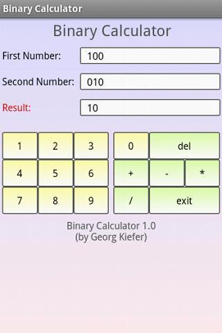 This app is the free version of "Binary calculator quot;, completely free and without ads!Binary Calculator is able to add, subtract, multiply and divide numbers in binary format (used in computers). Very useful calculator for school, college and work. Especially for students of math computer science and electrical engineering