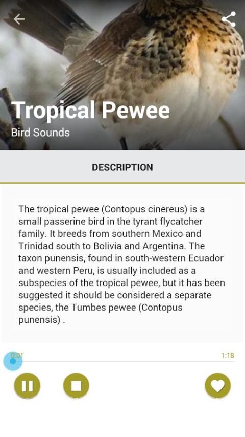 Птица звук может быть воспроизведен нажатием кнопки воспроизведения на ротатора. Птицы сгруппированы по семье или алфавитном порядке (с и без заголовка) в меню Вид.