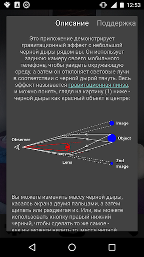 Использует камеру вашего телефона, чтобы имитировать черную дыру 1м (3,28 фута) от вас. Черная дыра масса здесь похожа на массы планет, таких как Марс или Землю. Вы можете изменить массу с щепоткой жест или слайдер. Позволяет также сохранить в полном разрешении фото черной дыры. Использует реальное поле углов зрения, с помощью камеры телефона.