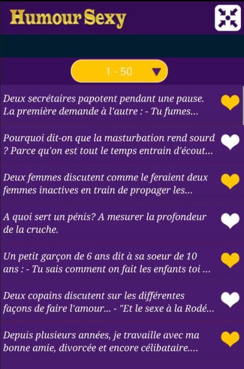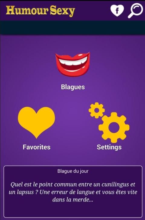 Юмор Сексуальная С помощью приложения вы имеете много вариантов, вы можете, конечно, также см шутки, и вы должны добавить Кнопки нажимные любимые шутки панели Избранное, вы также можете поделиться тем, кого вы любите слишком много на Facebook, с помощью E- электронной почты или текстовых сообщений.