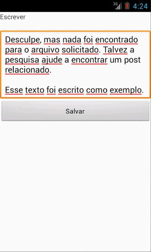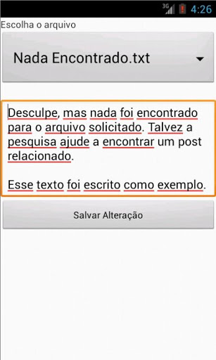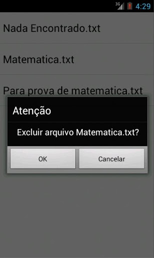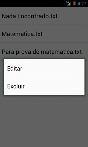Lista -> exibe uma lista com todos os aquivos salvos para leitura. Se você pressionar seu dedo sobre algum item será exibido um menu com duas opções: editar e excluir. Quando quiser consultar um arquivo ou ler seu conteúdo utilize a lista.