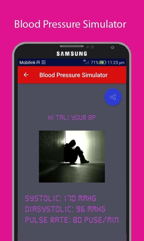 Это приложение розыгрыши разработано только для развлекательных целей. Показания для кровяного давления SYS, DIA и частоты сердечных импульсов случайным образом генерируют с помощью этого приложения. Всегда проверяйте артериальное давление, но только случайные значения. Средний результат будет не точным, как ваше кровяное давление. Наслаждайтесь этим имитатор артериального давления.