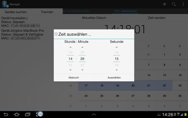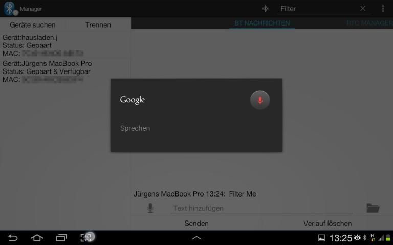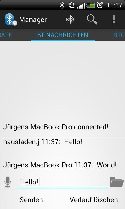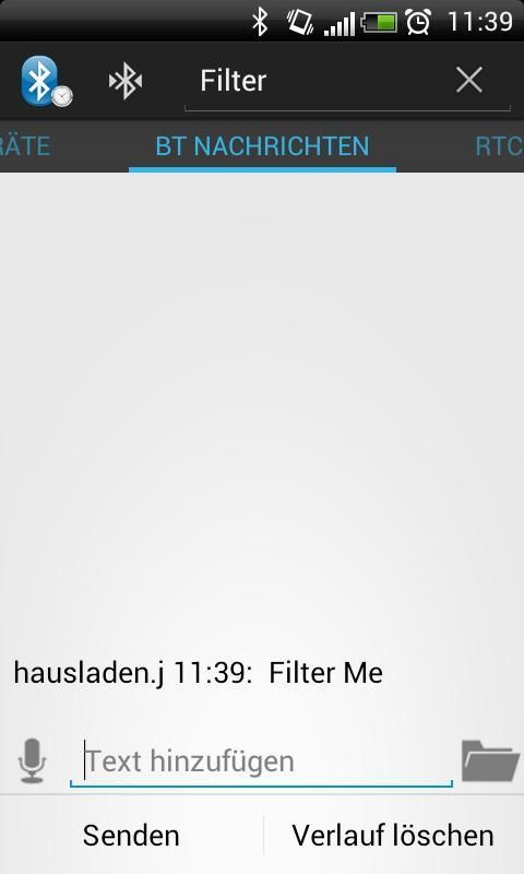 Bluetooth SPP Manager is an app, which provides communication between two Bluetooth devices. Therefore it uses the RFCOMM Protocol also known as Serial Port Protocol (SPP) to transmit data between devices. It is possible to see various properties of the Bluetooth devices around and connect to them as long as they support SPP. It is also possible, to open up a Bluetooth server, to accept incoming connections from any other device. Furthermore this app has an integrated Real Time Clock Manager. With this it is possible to send the current or predefined time to a remote device and can so be used for instance to set the RTC of a microcontroller and show the current time on a LCD. FEATURES: *Communication between Bluetooth devices via SPP (Iphone needs Jailbreak) *Speech Input for messages *Server for incoming Bluetooth connection *Save/Share the whole message history or single messages *Information about connected Bluetooth device, devices around or paired devices *Filter for messages *Timestamps for incoming/outgoing messages *Several newline characters *RTC Manager for transmission of time data to the microcontroller plattform *10-Byte mode for easy transmission of time to the microcontroller *Android Holo Design FULL VERSION: *Unlimited use of RTC Manager *No advertisements *Supports the developer ROADMAP: *Tablet/Landscape layout *Save own strings for transmission *Better compatibility for non ICS and above phones RIGHTS: The rights INTERNET and ACCESS NETWORKSTATE are used for the advertisements in the free version! INFO: 10 day full trial: At the end of the trial period the RTC Manager will be locked. All other features will still work. If you like the app, please support the developers and rate us. For questions, problems etc. please provide us feedback via E-Mail to juergen.hausladen@gmail.com. We will take on your questions and answer them as soon as possible. IMPORTANT: At the moment i have to disable the calendarview every time the keyboard pops up. This is because of a bug in the calendarview widget, which forces the app to hang the first time and close the second time a keyboard pops up and overlays the view. Therefore there may be bugs related to the used soft-keyboard. The app works great with standard Android keyboard. Please report compatibility issues with other keyboards. In this case just open the keyboard, close it again and the calendarview will be visible again. Keywords: Bluetooth, Serial, RFCOMM, SPP, Serial Port Protocol, RTC, Real Time Clock, Communication, Microcontroller