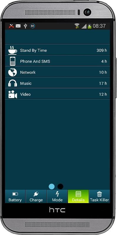 The name says it all: Boost My Battery HD gives your phone or tablet much more battery power! This application provides the best features to save the battery time of your phone or your tablet. Whenever your battery runs low or is losing too much power too fast then just tap the application to turn on the saving mode. Charge your phone less, use it longer and make your battery much stronger – Boost My Battery HD will do the trick! KEY FEATURES: - Free app - 3 modes for energy saving - Notification bar - Charge Alerts - Usage chart - Task Killer Feature Know instantly how much time you spend with your phone or tablet for: - Talking on the phone - Sending text messages - Listening to music - Watching videos - Internet Usage - Standby time - Battery health status - Temperature of your phone or tablet - Voltage Get all the details about YOUR battery: - Current in mAH - Health Condition - Temperature in Celsius(ºC) - Voltage in mV - Technology used - Plugged via USB or wall mount charger - Show Status if Charging or not charging Boost My Battery HD provides three types of modes to save your battery when it runs low. 1. Saving Mode: (Suggested to use in lowest Battery Status) Brightness set to 10% InActivate Wifi of the Device Stand By time set to 15 seconds 2. Sleep Mode: (Suggested to use when you sleep) Turn Off Call & SMS and turn ON the Flight Mode Vibrations Off Sound Off and mute the device. Brightness set to 10% 3. Customised Mode Easily customise all the modes depend on your usage to save Battery as much as you need. Can adjust the battery saving setting freely depend on your need and usage. Can adjust wifi, bluetooth, vibration, sound, device brightness, synchronisation and stand by time. On top there is a great and safe Task Killer Feature: - Display all the running apps with detailed memory, icon, update time, size - Kill the running task for power optimisation and memory consumption - Working as HUGE Memory Booster All this for free in one awesome app - go get it now!