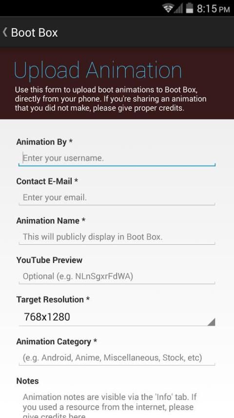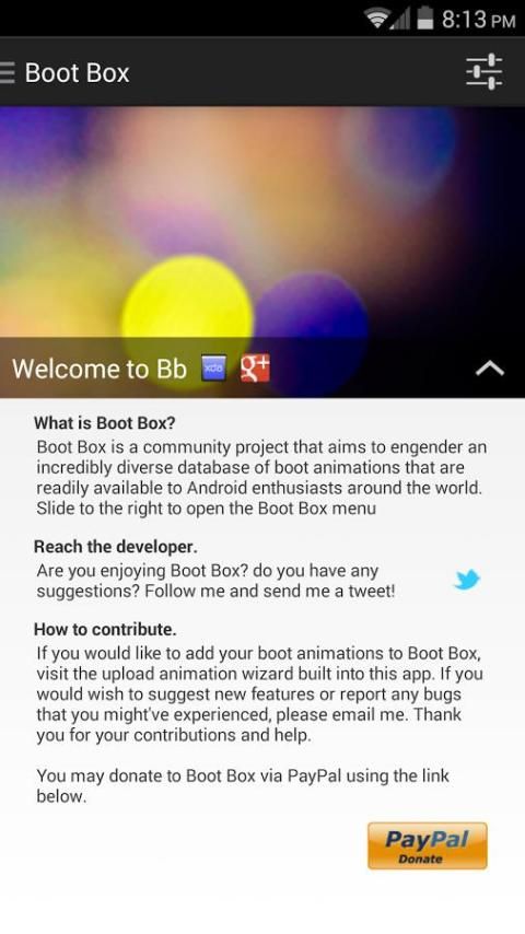 -boot Коробка Фабрика: создавать свои собственные анимации загрузки прямо с загрузочного Box! Создание статического анимации позволит вам, чтобы показать вашу любимую фотографию на загрузке. Создание слайд-шоу анимации позволит вам отображать несколько изображений на загрузке, каждый в течение установленного периода времени! (в крайнем случае, ограничение 10 картина рекомендуется).