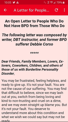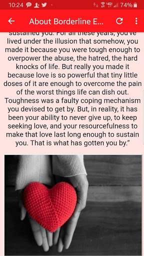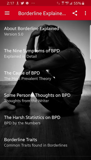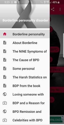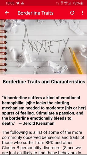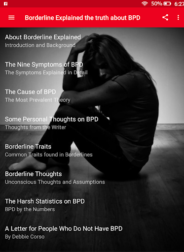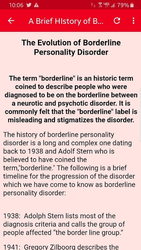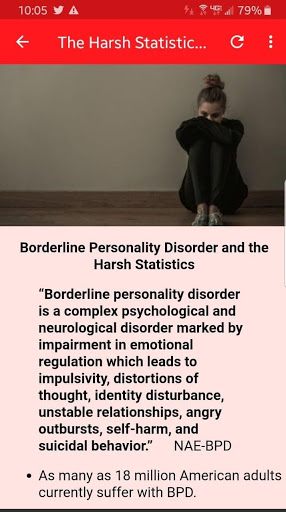Это приложение будет изучать пограничный расстройство личности, включая происхождение расстройства, симптомы и сопутствующее поведение, статистика, связанная с BPD, и текущие процедуры. Несмотря на то, что когда-то считалось, что BPD не лечится, теперь мы знаем, что с надлежащей психотерапией, многие люди с BPD, становятся лучше и даже полностью восстановим.