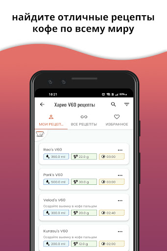 Лучший помощник любителю кофе «третьей волны»: добавляй свои рецепты, ставь лайки другим.