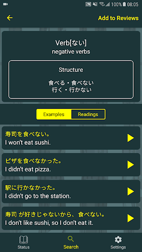 Bunpro SRS is a Android appication that helps you study Japanese grammar. Each grammar point has example sentences that build upon previous grammar as well as links to other great free online resources for additional information. Users can then review the grammar they have learned using SRS flashcards that are input-checked.