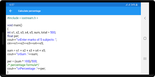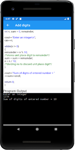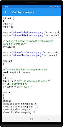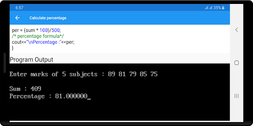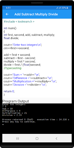 Вы не можете запустить или выполнять программы с этим приложением.Вывод уже протестирован и отображается для вашей ссылки.Спасибо за понимание.Мы обсуждаем со многими лектором и профессором;Они проверяют весь учебник и программы в приложении, что правильно.Мы просто предоставляем организованный способ легко изучить язык программирования C.