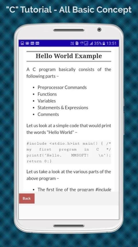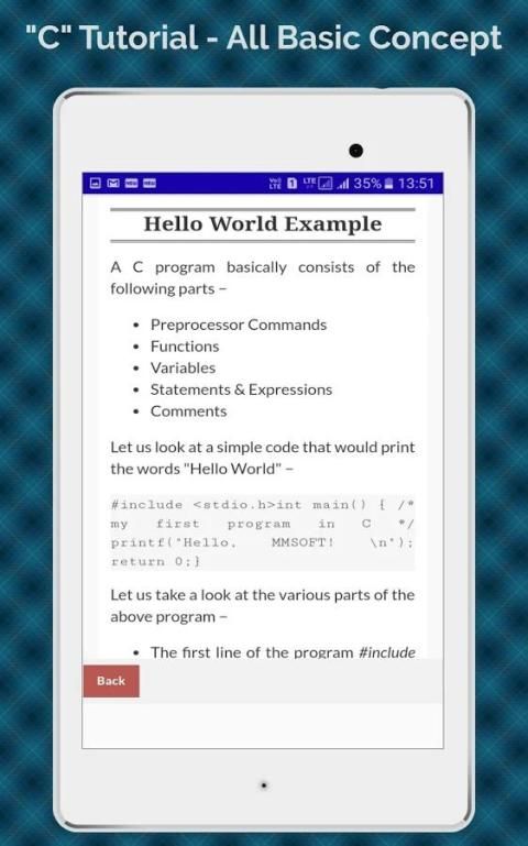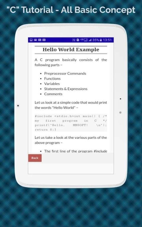 Это программирование C Учебник приложение поможет вам выучить язык программирования C помощью простого примера. Это программирование C Учебник App очень полезно для всех типов учащихся. Мы разработали эту C Программирование Учебник App в простой простой способ для того, чтобы она была легко понятна всем. Это программирования C Учебник App хорош для начинающих, чтобы узнать основные, а также передовые программирования C помощью простых и подходящих примеров.